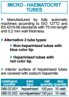 088.02.001 | 微型血细胞比容管-肝素化-100管/瓶 | 100管/瓶,10瓶/箱 | 箱 | 原价:¥860.00 现价:¥860.00 |