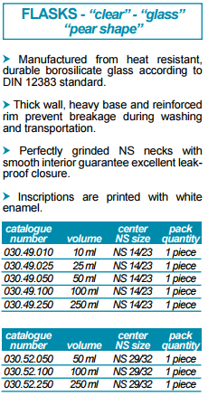 | 030.49.250 | 烧瓶-梨形- NS 14/23 - 250 ml | 硼硅酸盐玻璃 | 1支/包装 | 支 | 原价:¥353.00 现价:¥353.00 |