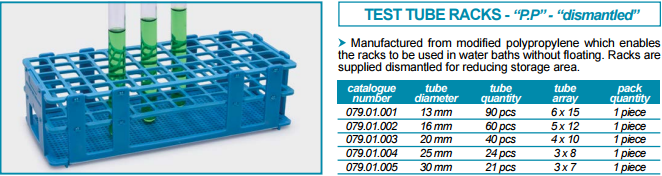 | 079.01.001 | 试管架-可拆卸 - 聚丙烯 | 90 孔 | for 试管直径13 mm | 改性聚丙烯 | 1支/包装 | 支 | 原价:¥110.00 现价:¥110.00 |