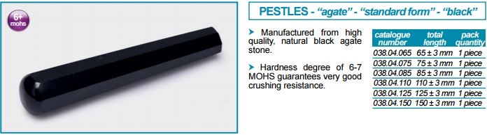 | 038.04.150 | 杵 - 黑色 玛瑙- 标准样 | 150 ± 3 mm | 优质天然黑玛瑙石 | 1支/包装 | 支 | 原价:¥1071.00 现价:¥1071.00 |