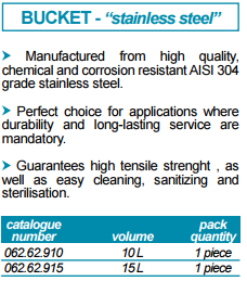 | 062.62.915 | 水桶- 不锈钢- 15 lt | 15L | 不锈钢 | 1支/包装 | 支 | 原价:¥1923.00 现价:¥1923.00 |