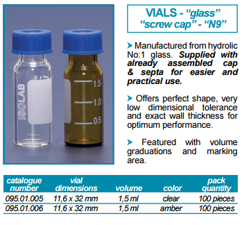 095.01.005 | 进样瓶+组合螺帽 - N9 - 1,5 ml - 11,6x32 mm - 透明 | 1.5ml | 11,6x32 mm | 透明 | 100支/包装 | 包 | 原价:¥589.00 现价:¥589.00 |