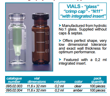 095.02.004 | 进样瓶-压盖式 - N11 - 1,5 ml - 11,6x32mm -带集成插件 (0,2 ml) - 琥珀色 | 11,6 x 32 mm | 琥珀色 | 100支/包装 | 包 | 原价:¥747.00 现价:¥747.00 |