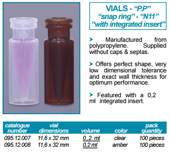 095.12.007 | 进样瓶-卡扣 - 聚丙烯 - N11 - 1,5 ml - 11,6x32mm -带集成插件 (0,2 ml) - 透明 | 11,6 x 32 mm | 透明 | 100支/*包装 | 包 | 原价:¥420.00 现价:¥420.00 |