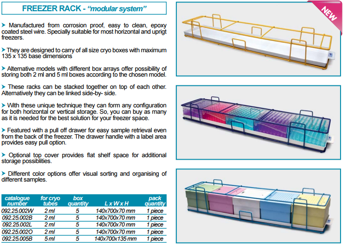 092.25.005B | 冻存架- 环氧涂层支架 - 水平式 for 5 ml 冻存管盒 - 蓝色 | 140x700x135 mm | 蓝色 | 环氧包覆钢丝 | 1支/包装 | 支 | 原价:¥1965.00 现价:¥1965.00 |