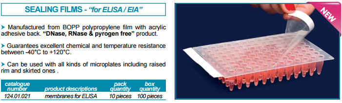 | 124.01.021 | 密封膜 - for ELISA 板(盘) | 10支/包装 | 包 | 原价:¥108.00 现价:¥108.00 |